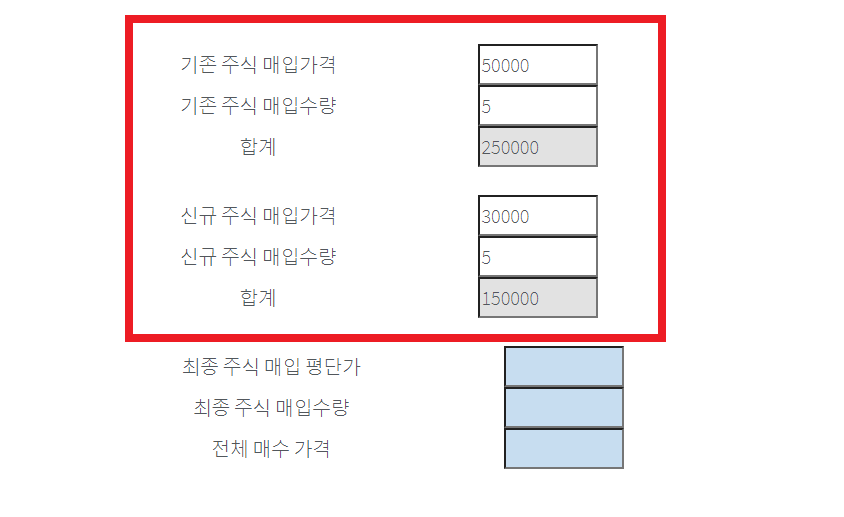 저는 예시로 기존 주식 매입가격을 5만원으로 5주 매입했다고 입력했는데요. 신규 주식은 3만원에 5주 매수한다고 입력해 보겠습니다.