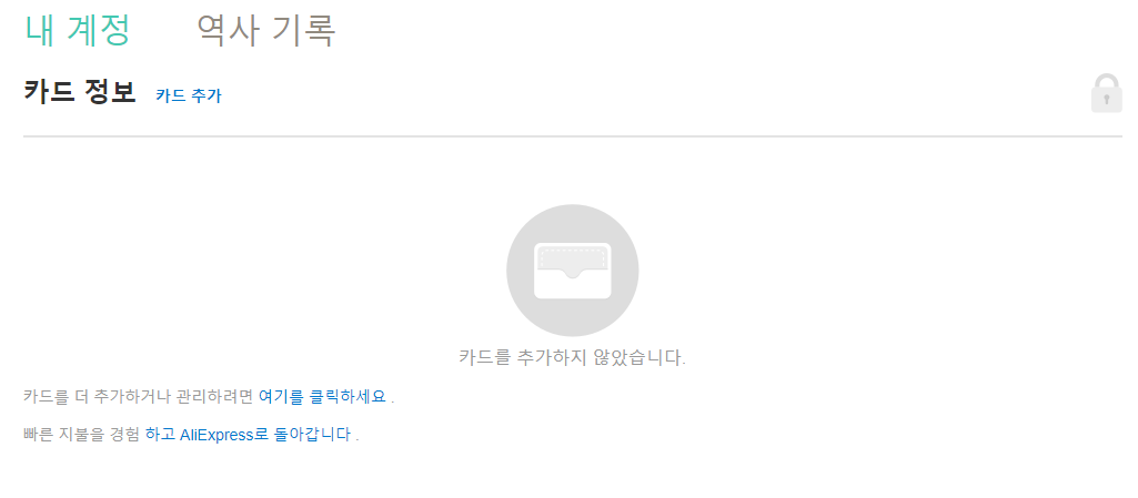 정상적으로 알리 익스프레스 카드 삭제가 완료되었다면 위와 같이 카드 정보가 없다는 메시지가 나타납니다.